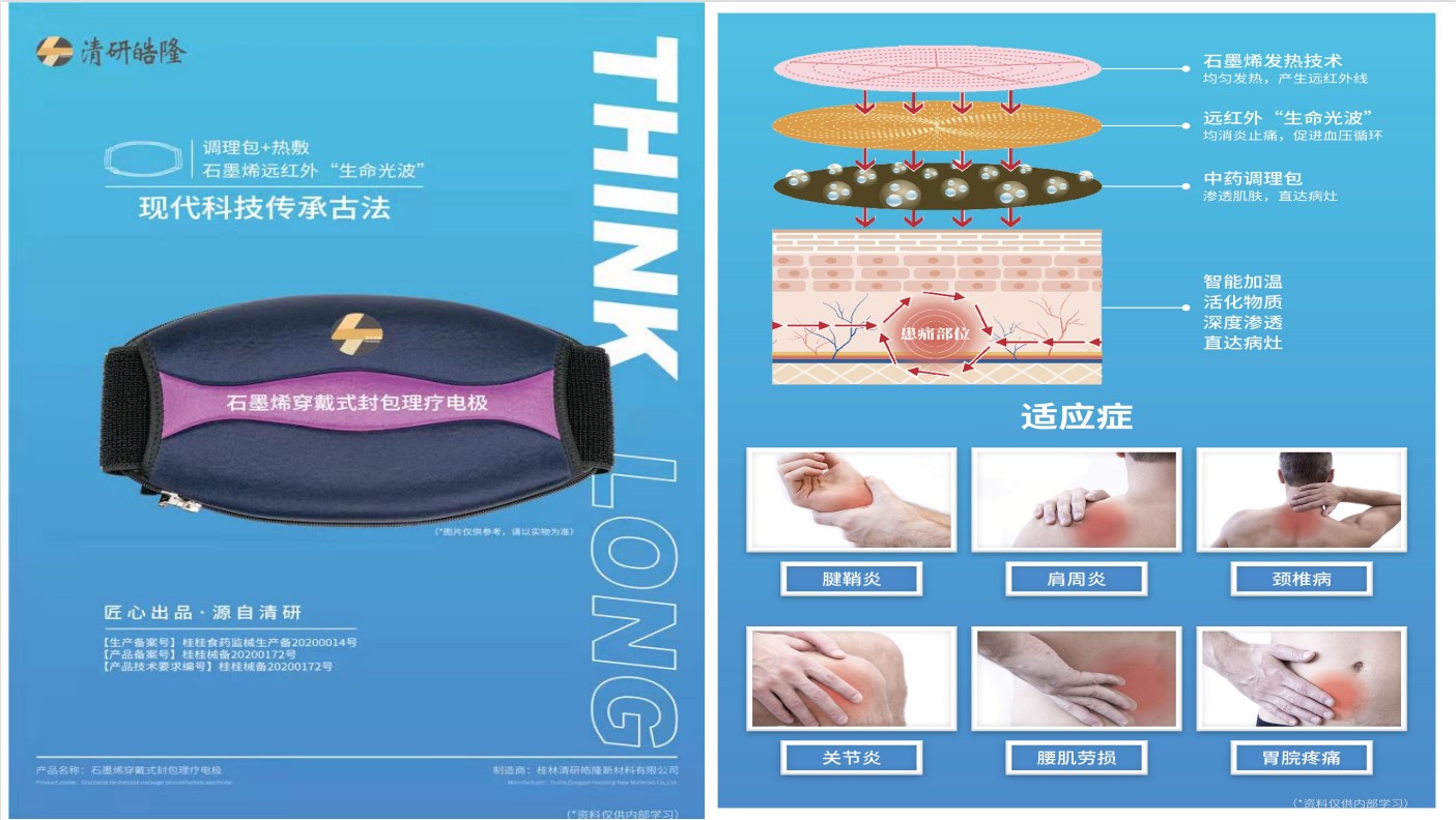 清研皓隆自主研發的石墨烯穿戴式封包理療電極分別將遠紅外醫療成果運用于腰、膝、肩等人體重要部位,通過醫學級和人體工學獨立設計,最大程度降低阻隔,直達關鍵部位,通過遠紅外線產生的熱效應使局部血管擴張,血流